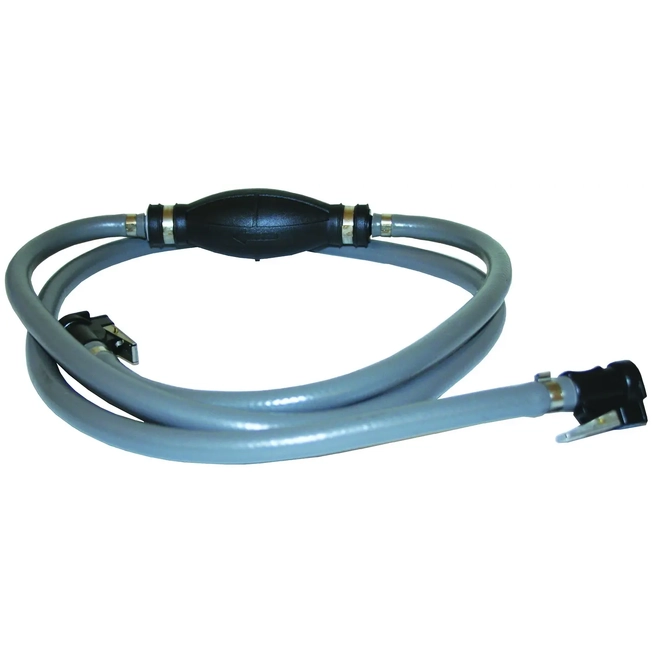 Quality reinforced UV and petrol resistant 3/8" 10mm fuel line hoses with high flow large rubber primer bulb and hose clamps. 2.1 metre total length. Available in five different types to suit various motor brands. Clamshell packed for open pegboard display.